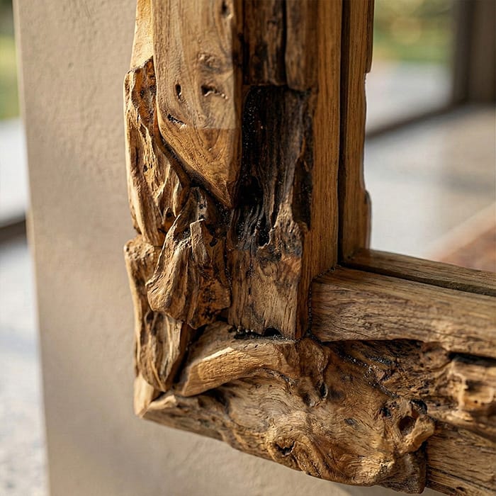 %100 masif ahşap iskeleti ve ince işçilikle örülmüş doğal hazeran detayları, ‘Soft Organic’ ve Japandi dekorasyon trendlerinin en prestijli örneğidir. Ahşabın sıcaklığı ve rattan örgünün hafifliği, bu dev aynayı bulunduğu odanın odak noktası (statement piece) haline getirir.