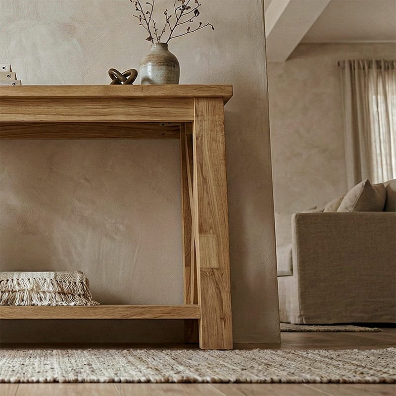 • Antre ve Hol: Misafirlerinizi doğal ahşabın sıcaklığıyla karşılayan, anahtarlar ve dekoratif kaseler için şık bir giriş mobilyası.