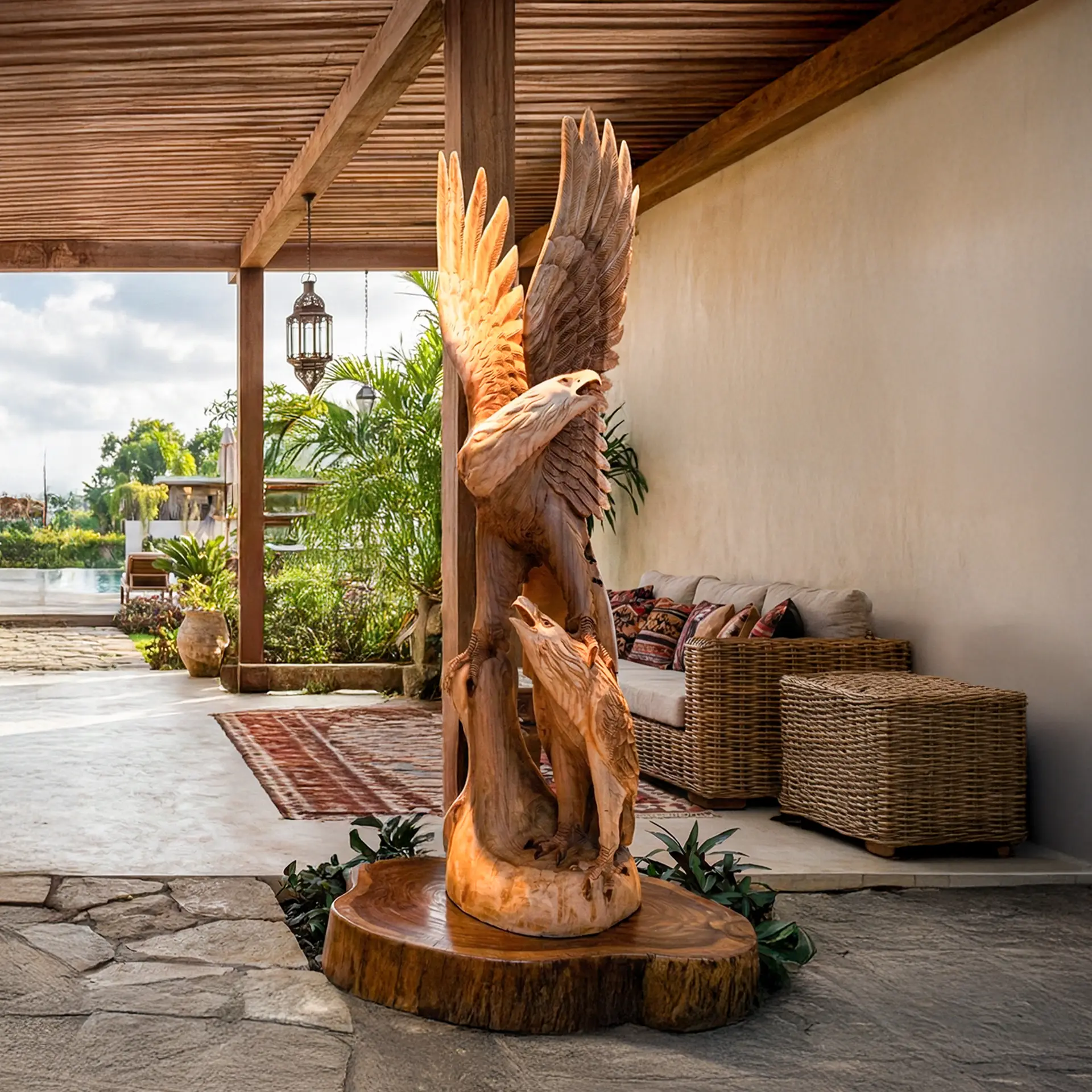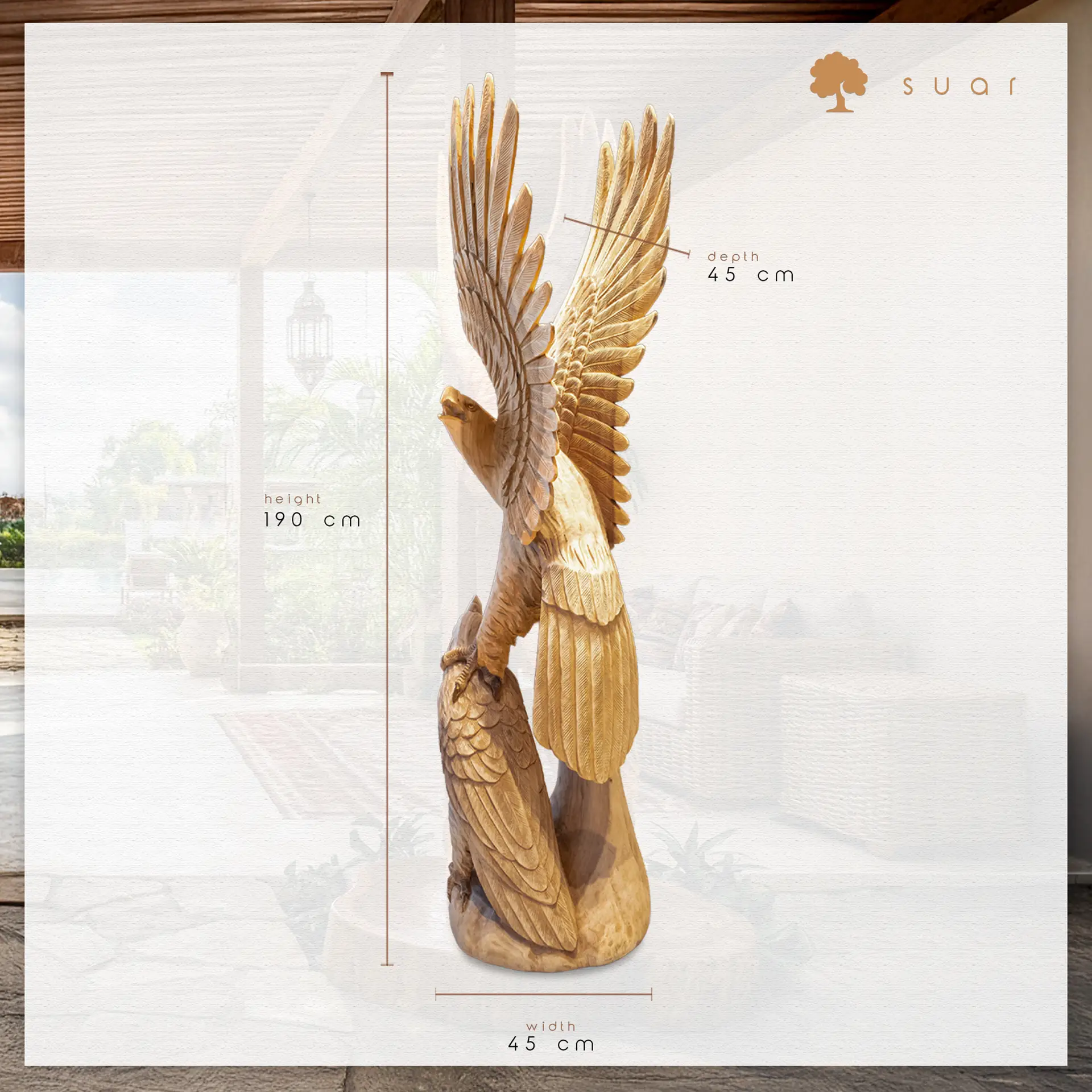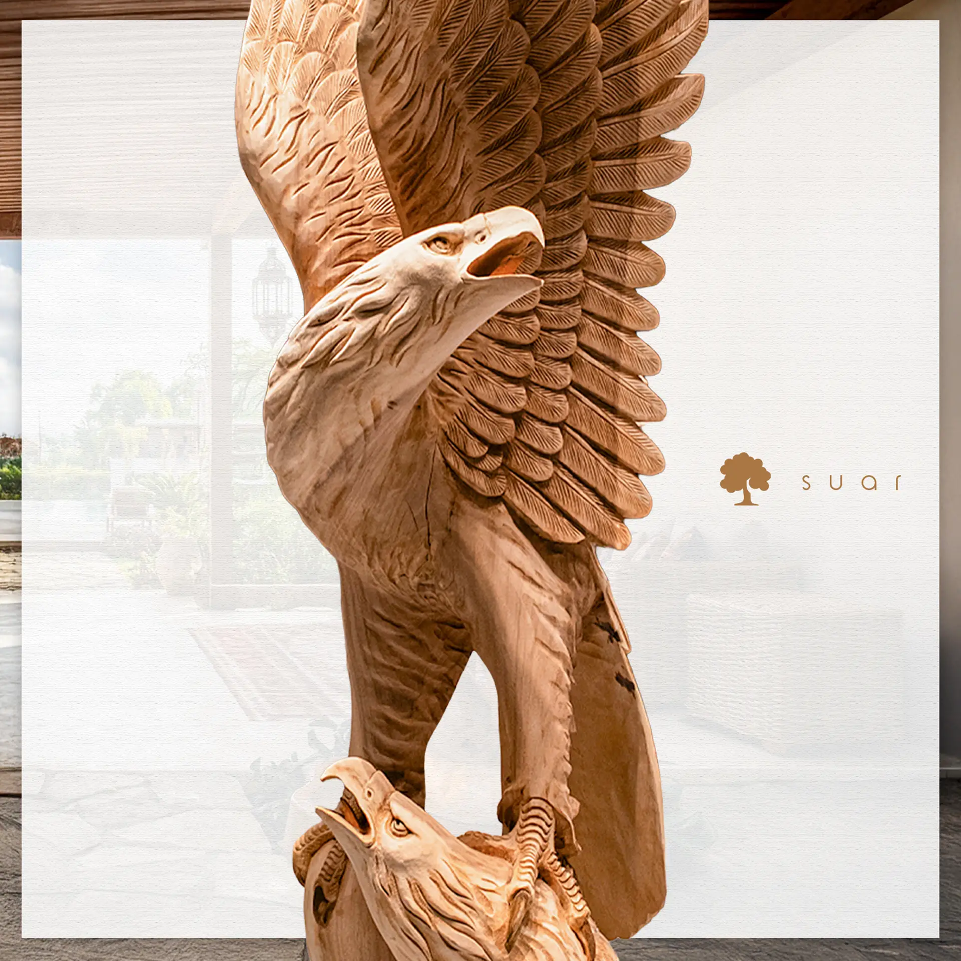 Malzemenin Asaleti: Suar (Yağmur) Ağacı Bu anıt heykel, tropikal iklimlerin en dayanıklı ve görsel olarak en zengin ağaçlarından biri olan Suar Ağacı’ndan (Rain Tree) üretilmiştir. Suar’ın kendine has hareleri, altın sarısından koyu çikolata rengine uzanan doğal geçişleri, heykelin kas ve tüy detaylarına inanılmaz bir derinlik katar.
