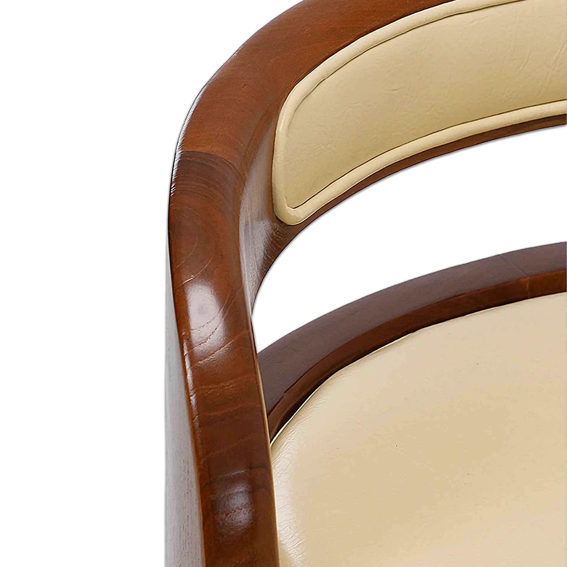 Tasarım ve Materyal Uyumu Mirea’nın tasarımındaki en çarpıcı özellik, kavisli masif ahşap sırtlığın yarattığı akıcı silüettir. Koyu ceviz tonlarındaki masif Tik (Teak) iskelet, krem rengi deri döşemenin yumuşaklığıyla kusursuz bir kontrast yaratır. Ayakları birbirine bağlayan krom çember, tasarıma modern bir ışıltı katarken, sandalyenin dayanıklılığını artıran sağlam bir yapı taşı görevi görür.