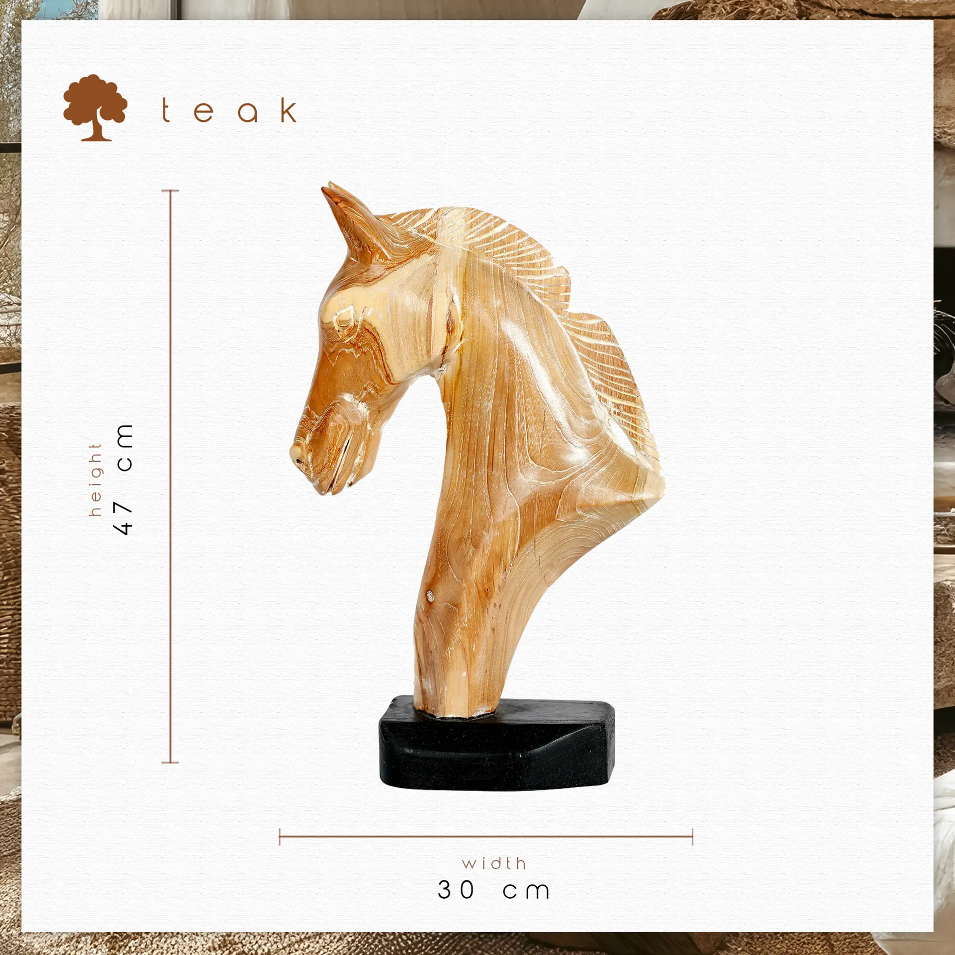 Tasarım ve Doku: Altın Dokunuş Bu büstü diğerlerinden ayıran en önemli özellik, kullanılan Tik ağacının “Blonde” (Sarı/Altın) tonlarındaki nadir dokusudur. Ahşabın kendi doğal hareleri, atın kas yapısını ve yüz hatlarını adeta bir mermer damarı gibi takip eder. Yele kısmındaki ince tarama detayları, pürüzsüz yüzeyle şık bir kontrast oluşturarak el işçiliğinin ustalığını sergiler.