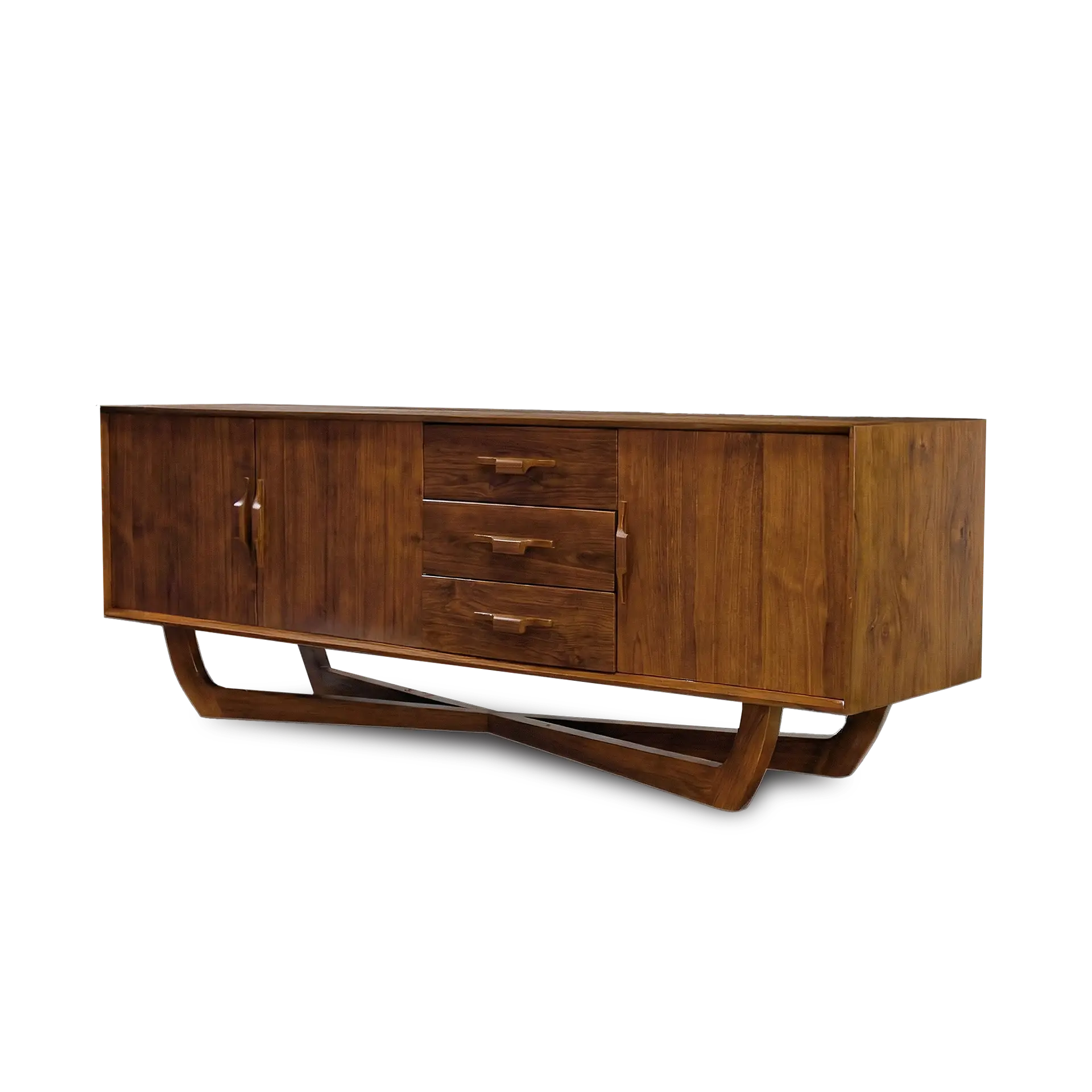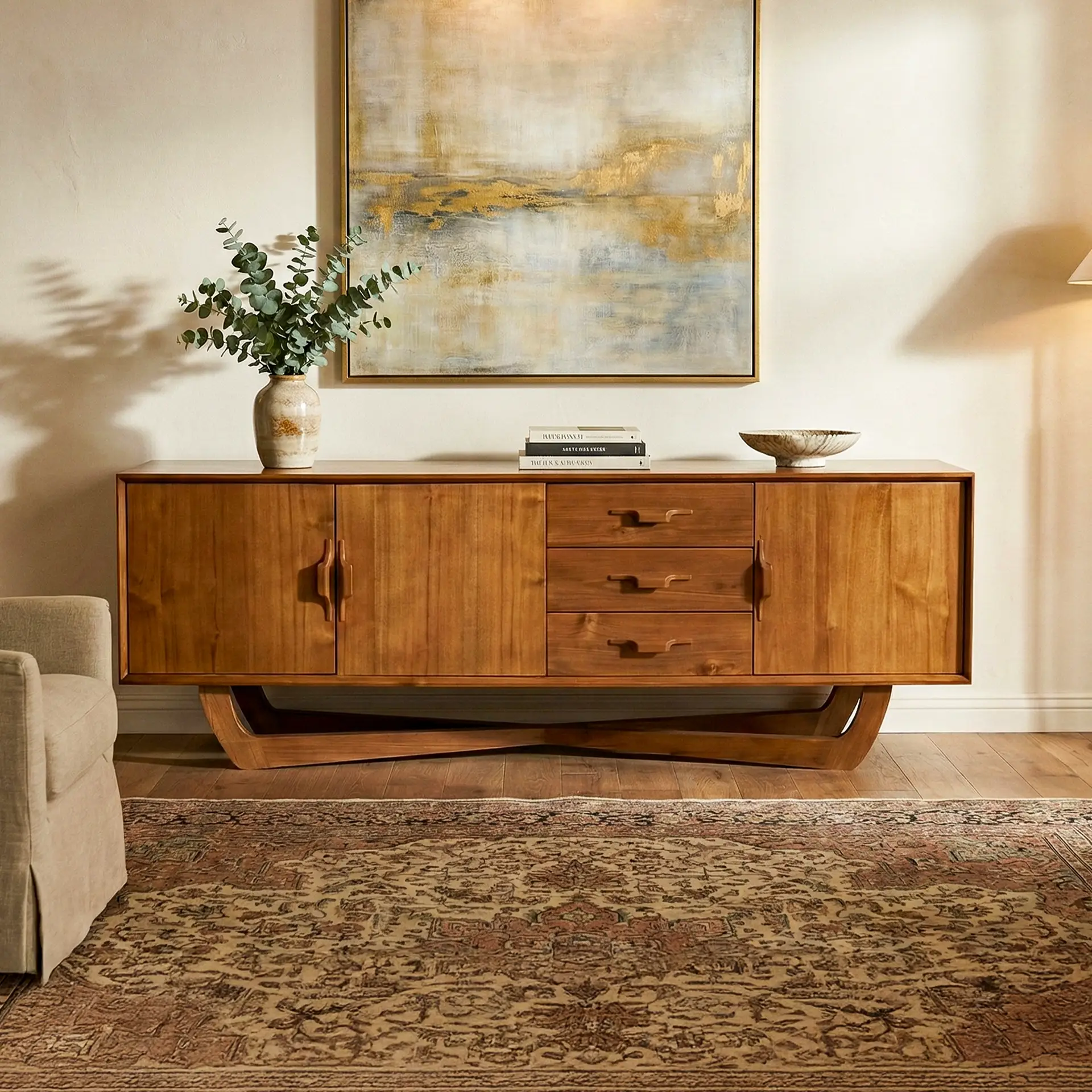 Tasarım Detayları: Akıcı ve Heykelsi Form Ürünün karakterini belirleyen en önemli unsur, zeminde kesintisiz bir akış yaratan özel tasarım çapraz ayak (cross-base) yapısıdır. Bu heykelsi kaide, mobilyanın havada süzülüyormuş gibi hafif görünmesini sağlarken, yapısal sağlamlığı da artırır. Cephe tasarımında metal kulp kullanımından kaçınılarak, ahşabın kendisine oyulmuş organik formlu entegre kulplar tercih edilmiştir. Bu detay, tasarıma pürüzsüz ve bütüncül bir dokunuş katar.