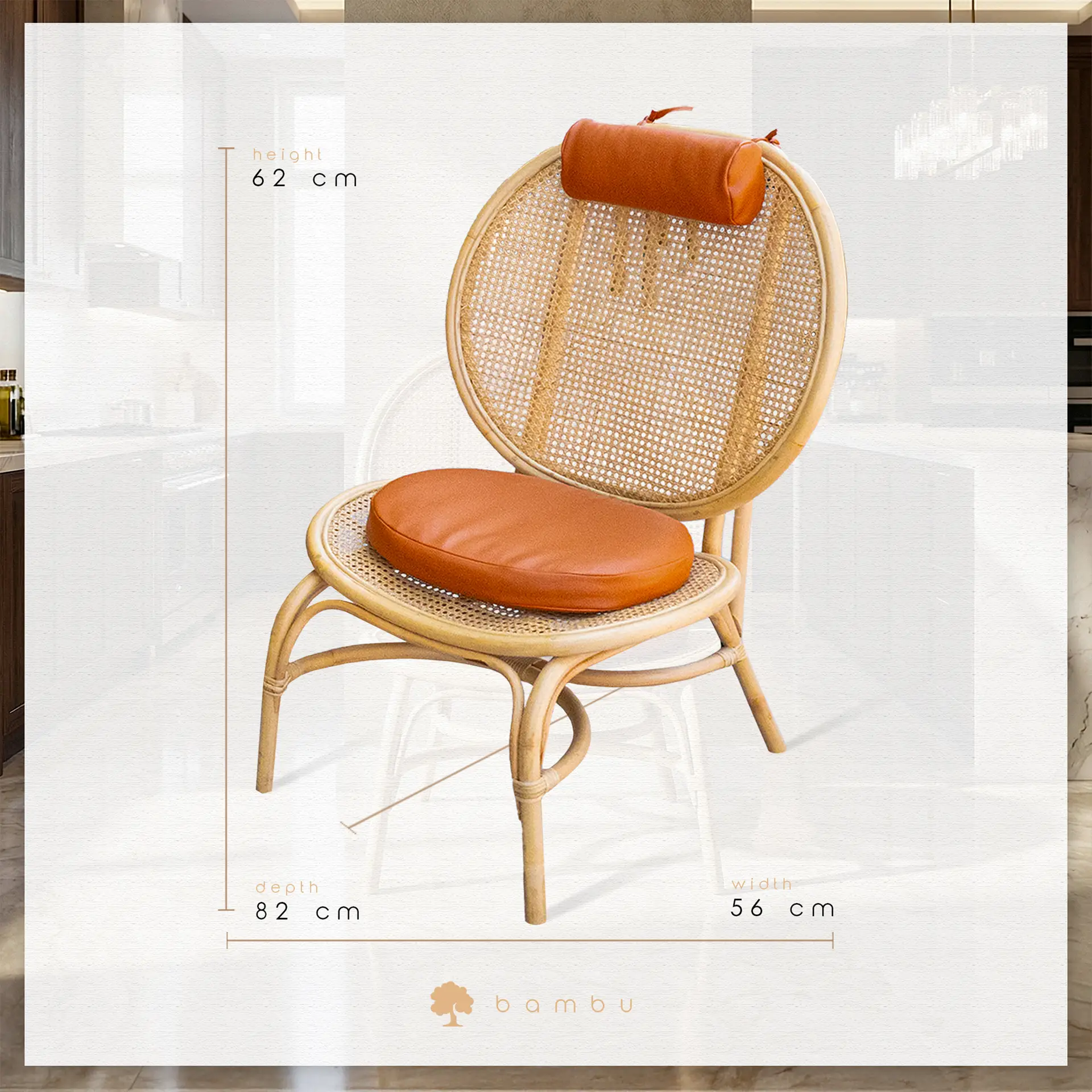 Doğal Materyal ve Üstün El İşçiliği Endonezya’daki üretim tesislerinde tamamen el işçiliği ile üretilen bu özel tasarım, masif bambu gövdenin sağlamlığını ve doğal rattan (hazeran) örgünün zarafetini bir arada sunar. Sentetik veya plastik malzeme içermeyen yapısı, doğaya saygılı ve sürdürülebilir bir dekorasyon anlayışını temsil eder.
