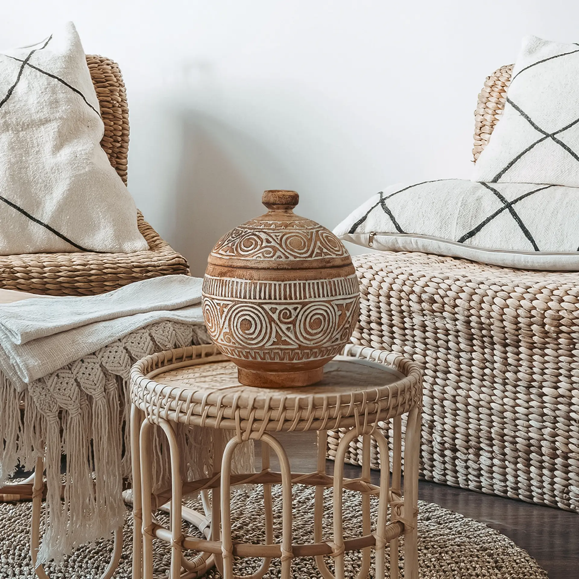 Dekorasyonda fark yaratan detaylar, genellikle el emeği ile şekillenen parçalarda gizlidir. Tribal Essence Dekoratif Küp, masif tik ağacının doğallığını, antik çağlardan ilham alan desenlerle buluşturuyor. Hem görsel bir obje hem de gizli bir saklama alanı olan bu tasarım, “Boho-Chic” ve “Rustik” tarzı mekanların vazgeçilmez tamamlayıcısıdır.