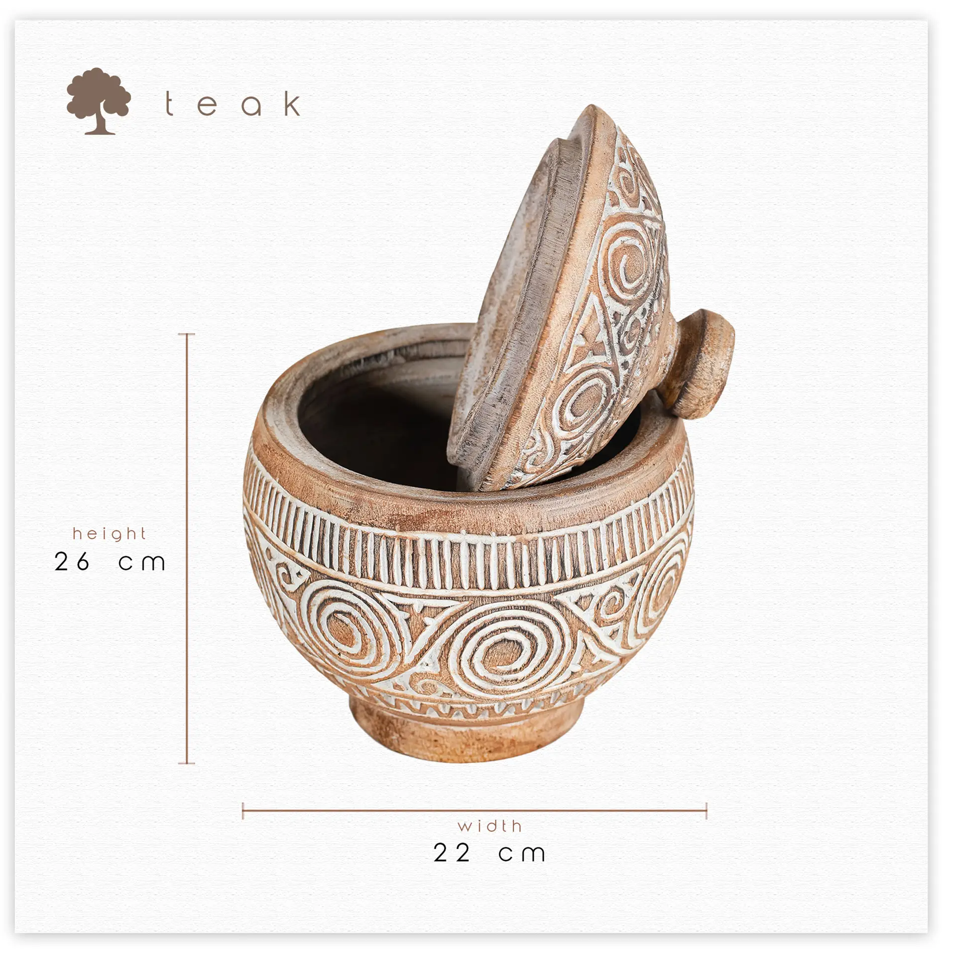 Tasarım ve İşçilik: Spiralin Büyüsü Ürünün gövdesini ve kapağını saran helezonik (spiral) oymalar ve geometrik şeritler, sonsuzluk ve döngü kavramlarını sembolize eder. Tik ağacının doğal rengi üzerine uygulanan beyazlatılmış eskitme (whitewash) tekniği, bu oymaların derinliğini artırarak desenleri üç boyutlu hale getirir. Her bir çizgi, makine değil, usta bir elin yontmasıyla şekillenmiştir.
