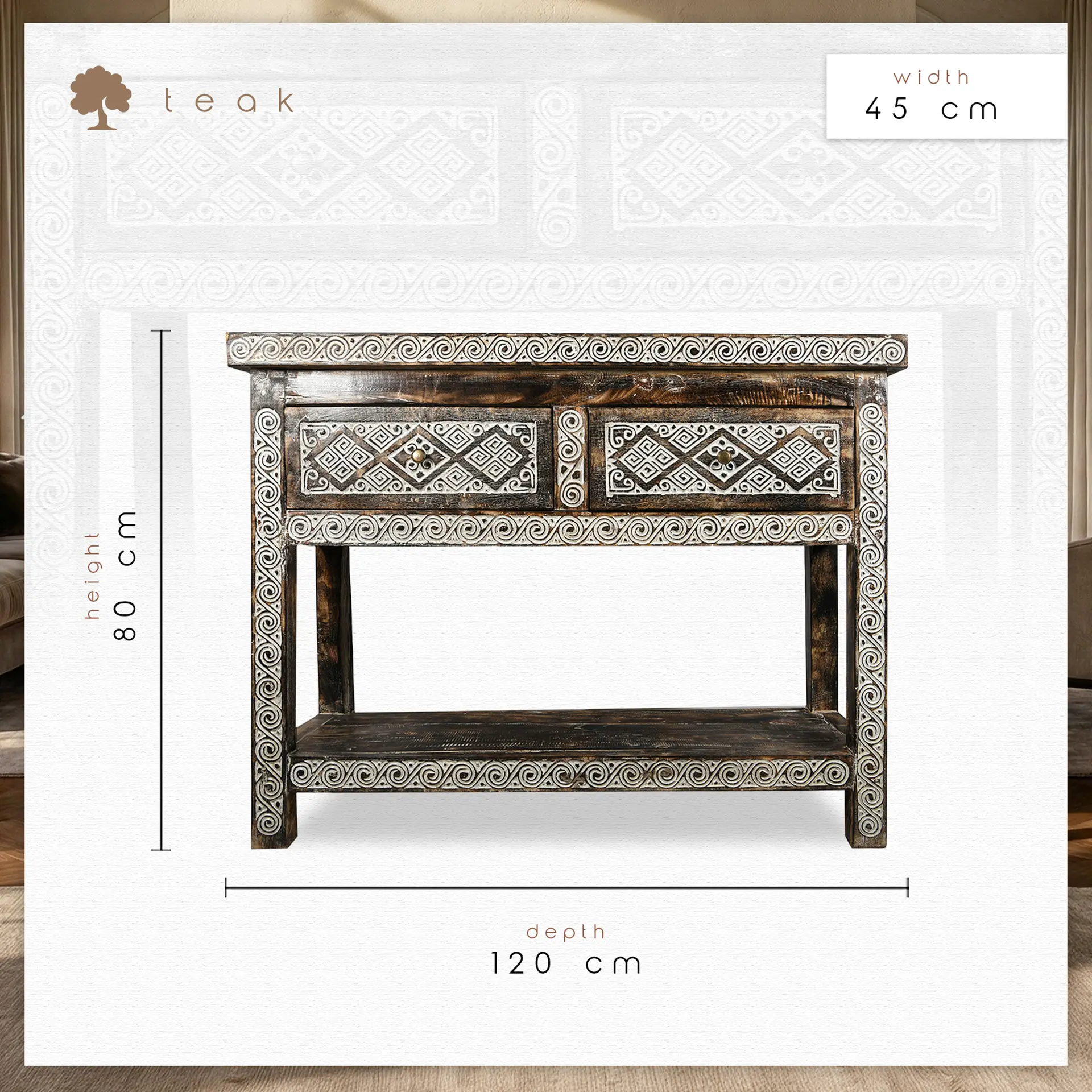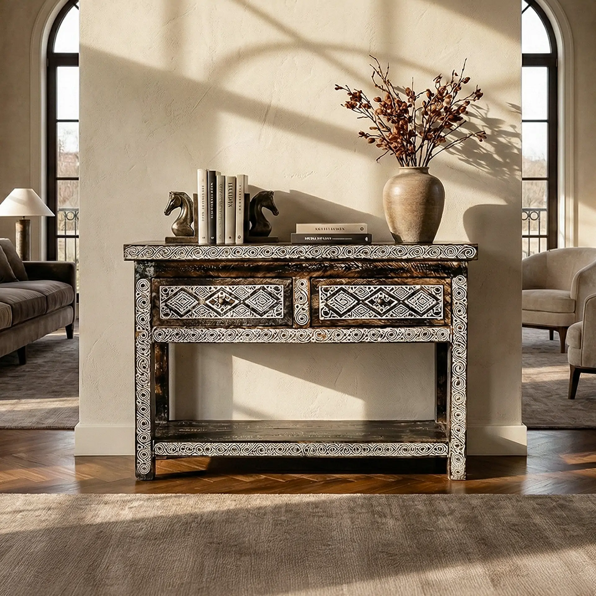 Etnik Sanatın Modern Yorumu: Tribal Heritage: El Oyması Etnik Desenli Masif Tik Konsol (120 cm)