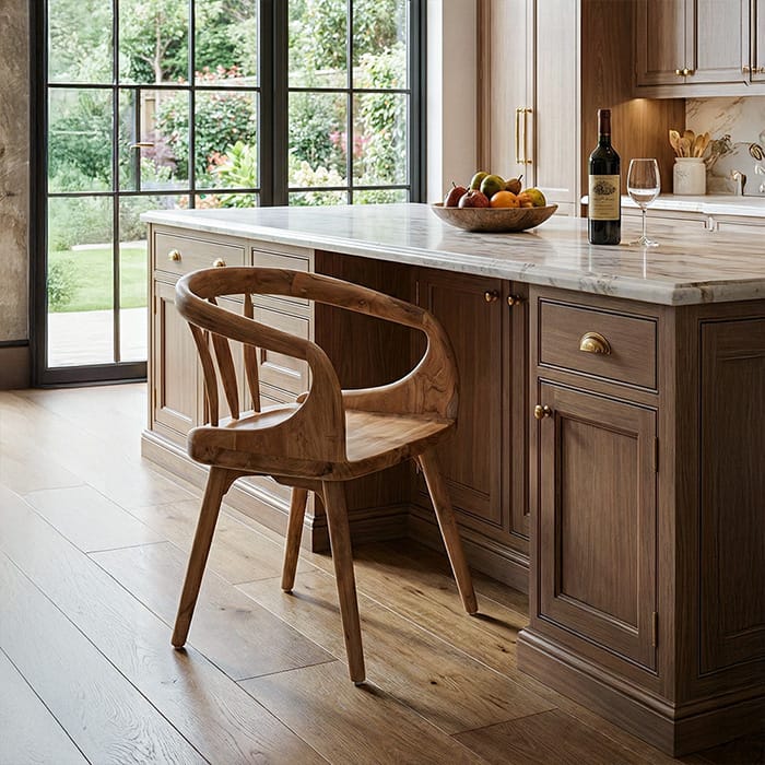 Ergonomik ve Organik İşçilik Sadece göze değil, bedene de hitap eder. Özel olarak şekillendirilmiş (sculpted) ahşap oturma selesi, masif ahşabın sert yapısını unutturacak düzeyde bir oturum konforu sağlar. Yüzeyindeki doğal damarlar ve mat cila, ağacın yaşanmışlığını her bir kavisinde gözler önüne serer.